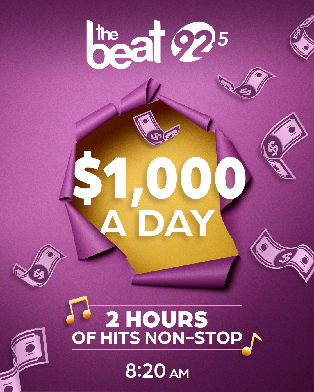 The The Beat’s $1,000 a Day Giveaway!Contest is organized by Cogeco Media Inc. It begins on March 2, 2026 at 8:20am (EDT) and ends on March 20, 2026 at 12:00pm (EDT). All references to time in these rules and regulations refer to Eastern Daylight Time (EDT).