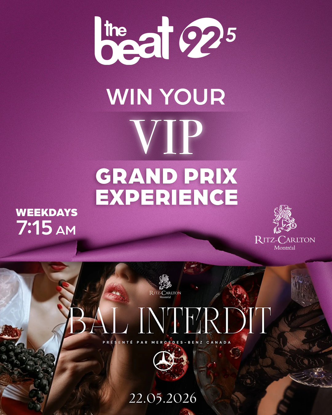 Montreal’s biggest party of the year is happening on May 22nd… And The Beat is the only station in Montreal that has got your VIP tickets to The Ritz Carlton’s Grand Prix Party… Bal Interdit: Evening After Dark: Presented by Mercedes-Benz Canada!